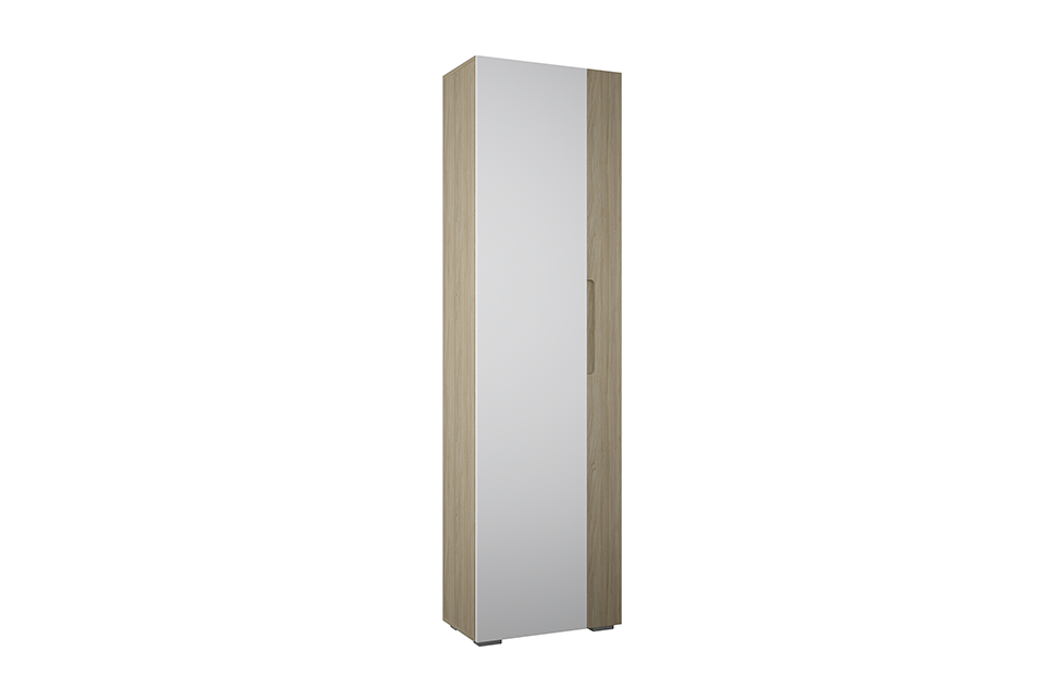 Прочные фасады из МДФ в ПВХ-пленке текстурированы под дерево «швейцарский вяз» и украшены вставкой базового белого цвета. Такое оформление зрительно вытягивает помещение в вертикальном направлении. Все детали облицованы кромочным материалом высокого качества, защищающим древесную плиту от порчи и расслоения. Внутри одностворчатый шкаф укомплектован евроштангой и двумя полками, по запросу покупателя могут быть установлены 4 полочки из ламинированной ДСП. В комплектацию входят крепеж и фурнитура.