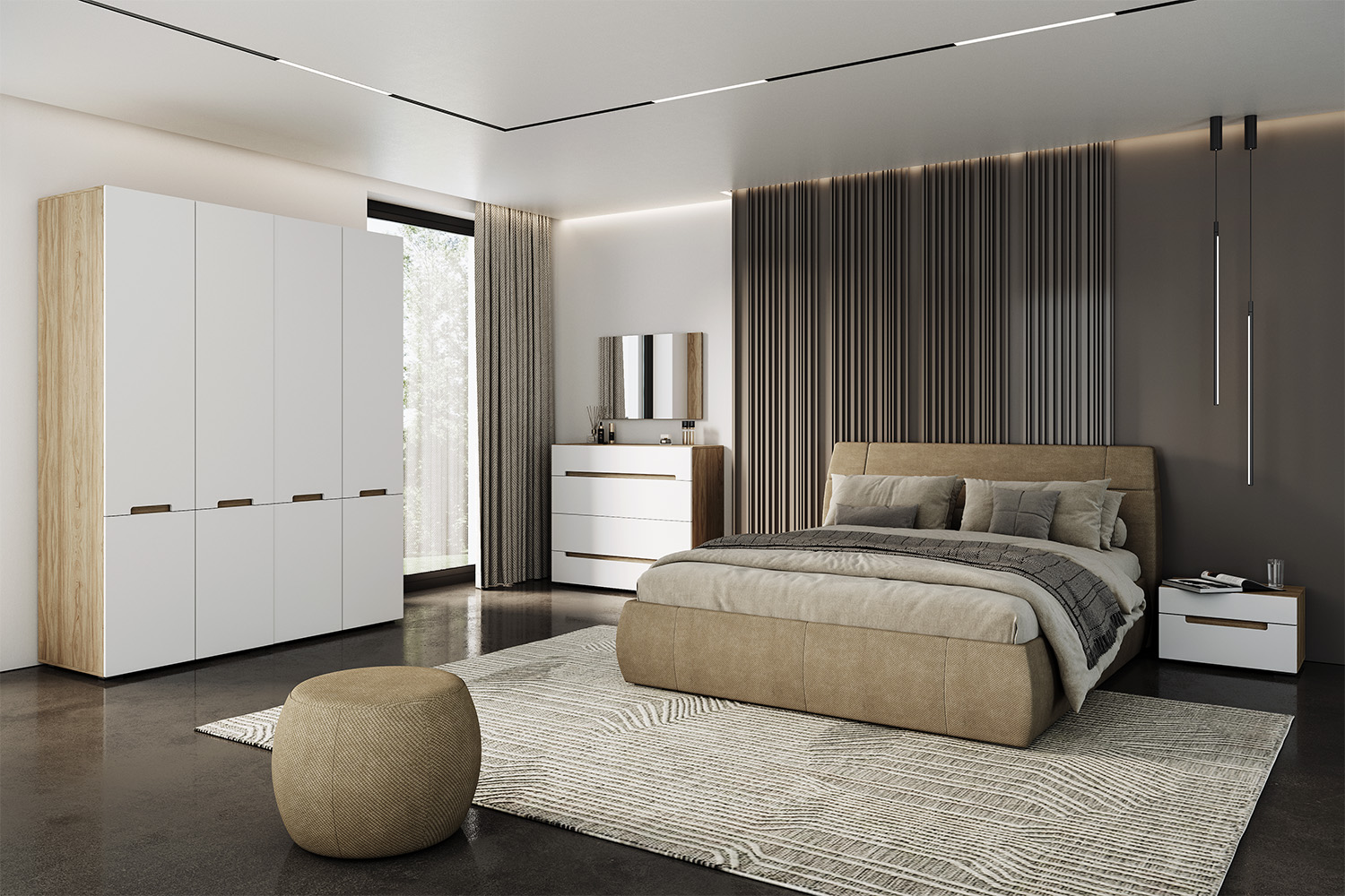 - Комод напольный с четырьмя выдвижными ящиками (каждый ящик с двумя отделениями). В выдвижных ящиках используются направляющие скрытого монтажа со встроенным доводчиком;