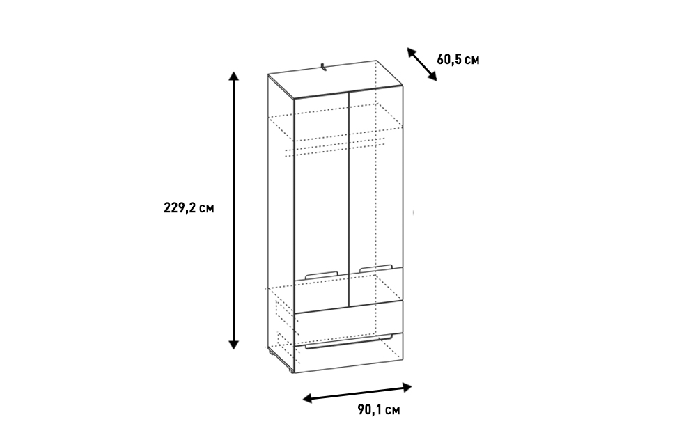- Шкаф укомплектован полкой, штангой для одежды и двумя выдвижными ящиками в нижнем отделении;