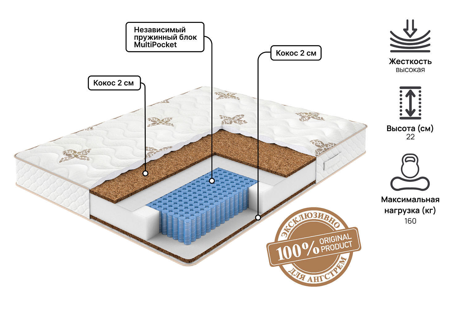 В основе матраса Absolute блок независимых пружин MultiPocket, 1000 пружин на спальное место. Благодаря высокой плотности пружин он обеспечивает качественную поддержку позвоночника, выдерживает большие нагрузки и равномерно распределяет вес по всей горизонтальной поверхности матраса. Кокосовая койра с обеих сторон обеспечивает максимальный ортопедический эффект благодаря повышенной жесткости. Чехол выполнен из итальянского вискозного трикотажа, простеганного на объемном синтепоне.