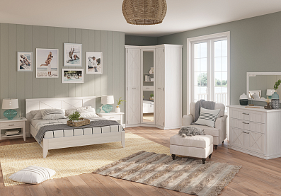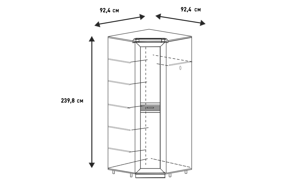 - Шкаф угловой с зеркальным фасадом, укомплектованный полками, планкой и штангой для одежды;